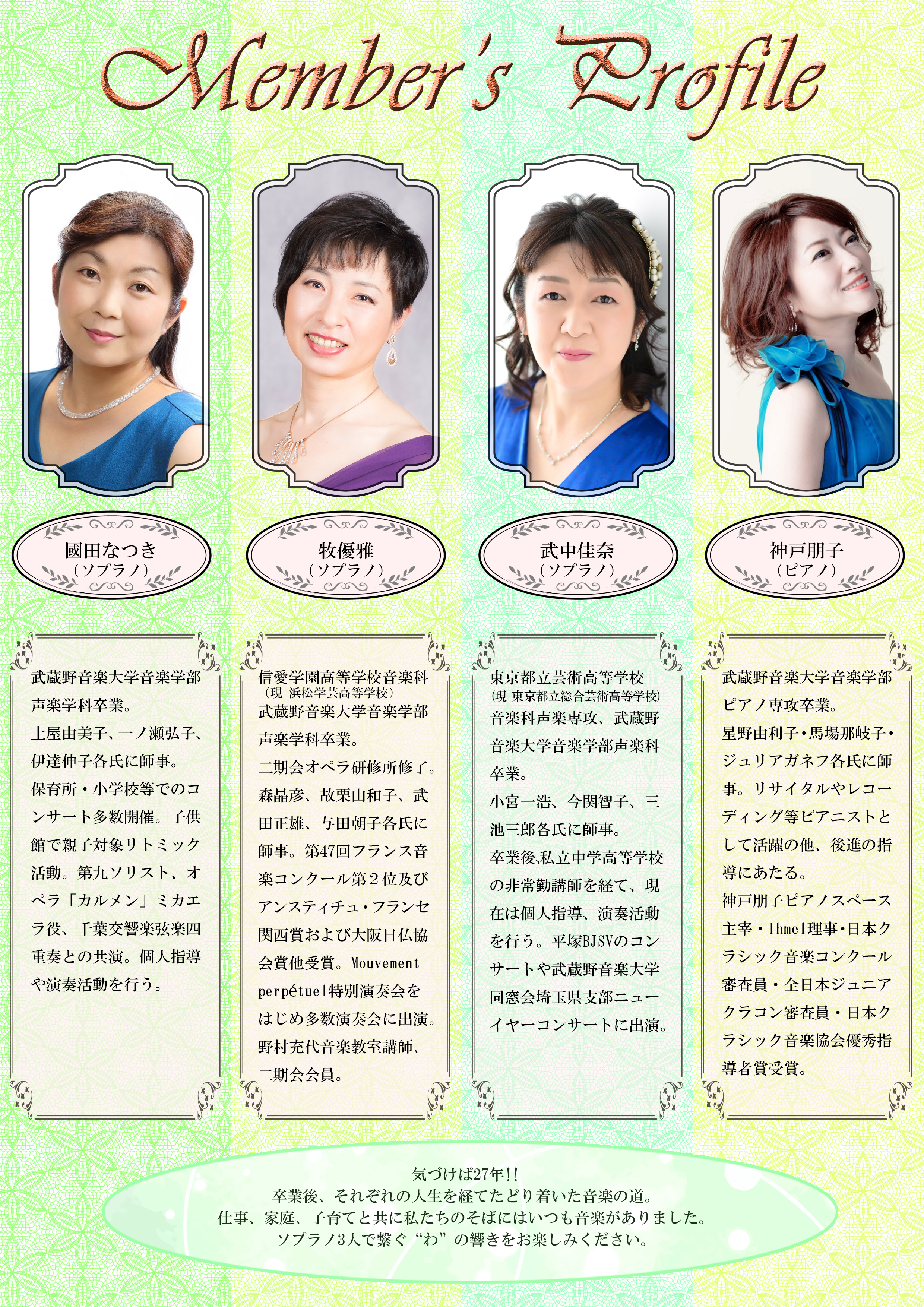 2009年11月3日(祝) 13時30分〜 場所:文京シビックホール(小) <入場料> (全席自由) 一般・・2500円 中学生以下・・2000円 <出演> 神戸朋子(ピアノ) 内藤麻奈美(ピアノ) 榊原敬幸(フルート) 川村ゆみ(ヴォーカル) 山岸玲子(ピアノ) 坂野志麻(ピアノ) <プログラム> ハチャトゥリアン 仮面舞踏会より「ワルツ」 ベートーヴェン 熱情ソナタ ショパン 別れの曲 ピアソラ 荘厳なるタンゴ ビリー・ジョエル オネスティ ・・・ほか ・・・ピアノソロや連弾のほか、男性フルートの繊細かつパワフル、荘厳な調べとともに 様々な音色をお届けします。 そして今回、NEWS・安室奈美恵など数々のアーティストと共演しているスタジオミュージシャン、 『川村ゆみ』さんをゲストにお迎えして 様々なムードを盛り込んだ楽しいコンサートとなっています♪ 無事終了いたしました |